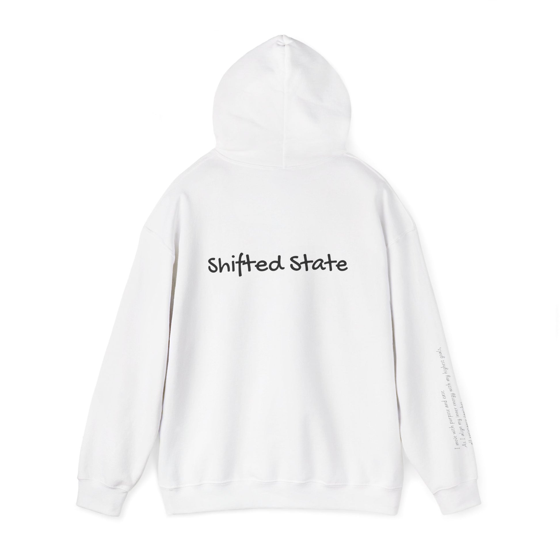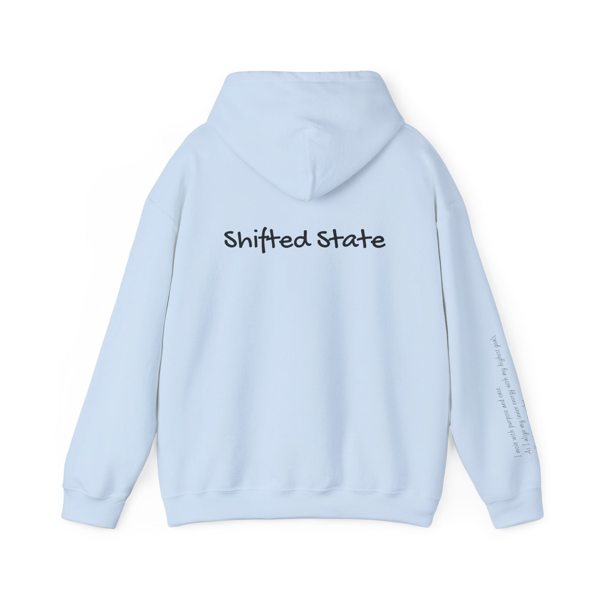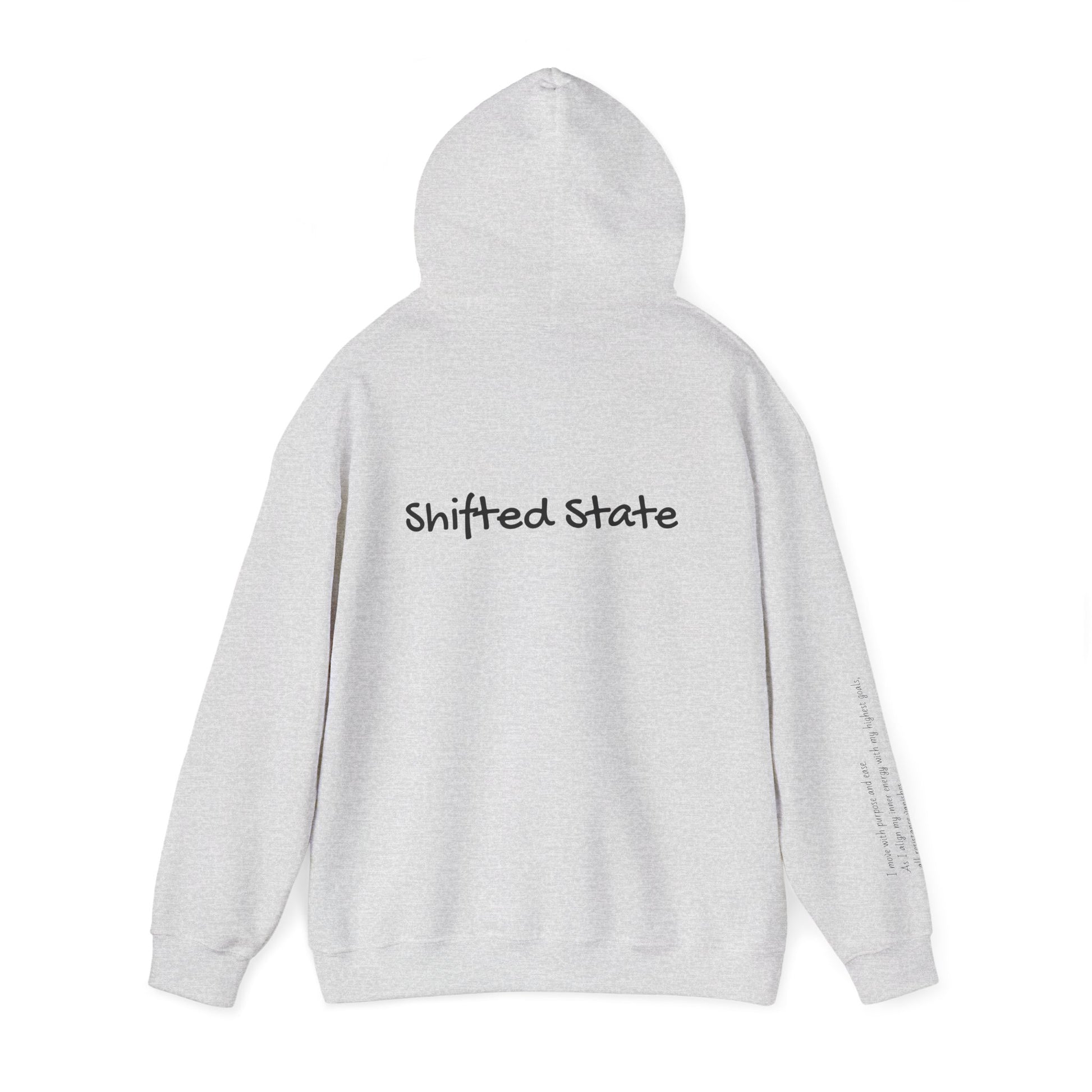 This hoodie is a wearable reminder to slow down and realign. Soft, substantial fabric wraps you in calm while the understated chest logo anchors you to a community of focused makers. Turn around and the bold “Shifted State” message announces a new approach to effort — work that flows from clarity instead of force. The right sleeve carries a short affirmation you’ll catch in moments of rush or decision: a quiet nudge to breathe, re-center, and move with purpose. Pockets, a double-lined hood, and a color-matched drawcord keep it functional; durable prints and optional embroidery mean the message stays true through many washes. Wear it to steady a hectic morning, step into a creative session, or carry intention into the day-to-day.